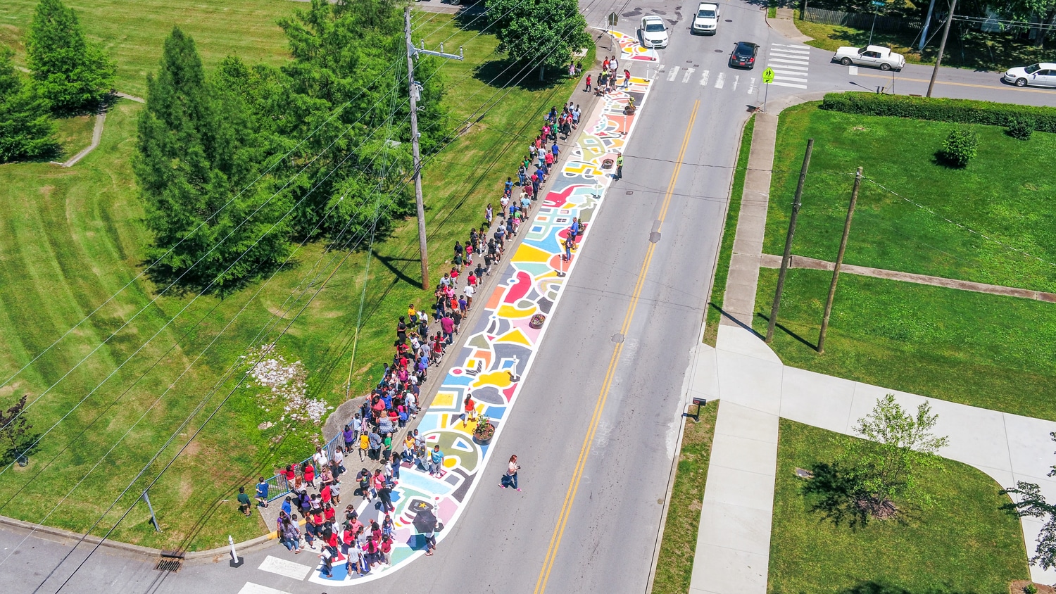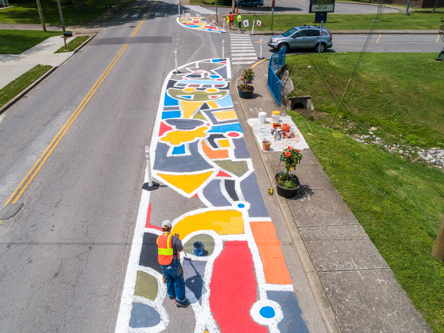Art, Drones and a more walkable/bikeable Nashville? Yes, please! That is just what came together last week at Amqui Elementary School in the Madison suburb of Nashville. One of WalkBike Nashville mission is to create safer routes to school, so the organization WalkBike Nashville contracted with artist Andee Rudloff to make a splash. So Aerial Innovations showed up and captured it all from the air with their drones.